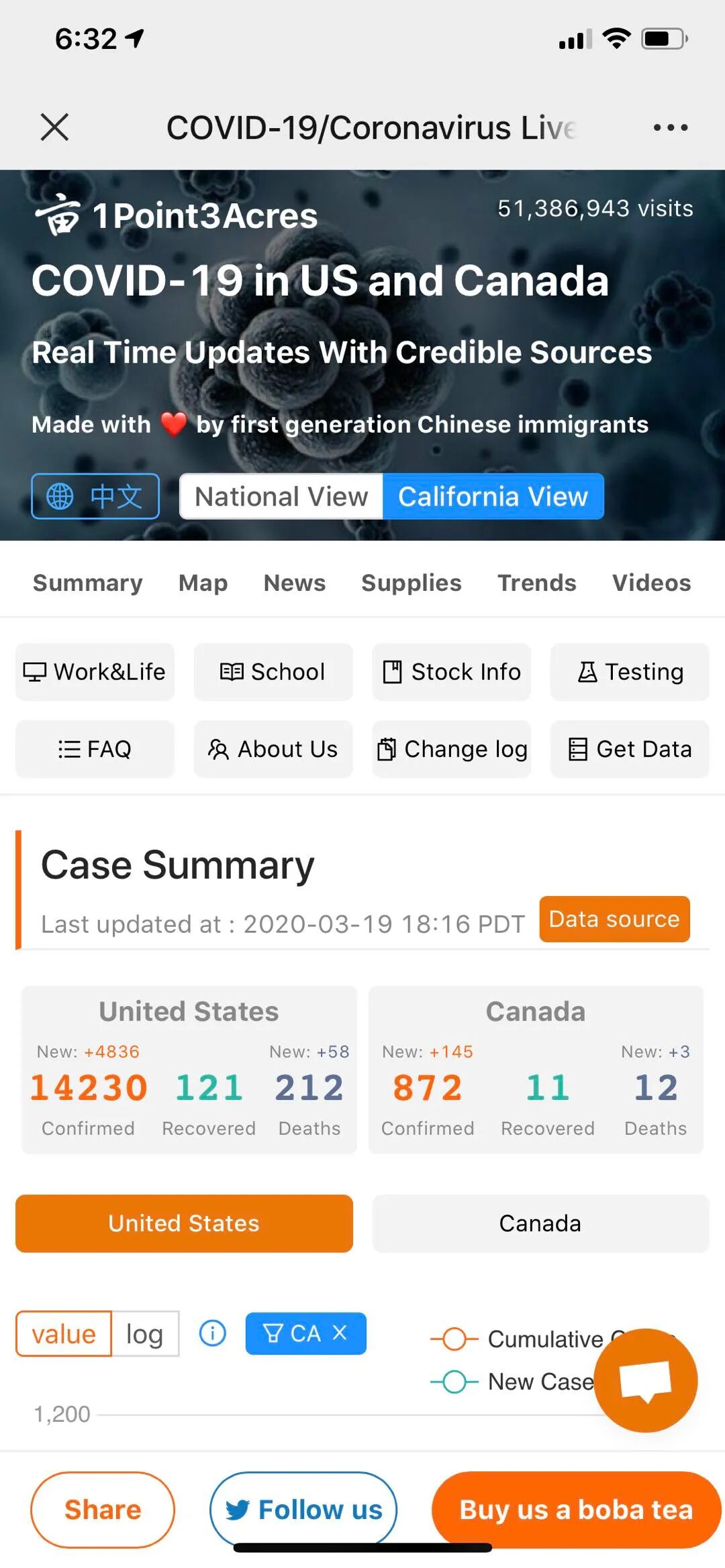 除了以上这些社区中的互助外,新冠疫情中,另外一个不能忽视的华人群体,就是华人在线社区“一亩三分地”,和每天在他们建立的中文和英文网站上实时更新疫情的工程师和数据志愿者。在美国的很多人,每天都是靠着刷新“一亩三分地”的网站来了解新冠疫情在美国的传播情况。截至发稿,中文、英文新冠疫情网站加起来,已经有5100万次点击。目前,包括全职工程师和志愿者在内,有几十个人每天在维护着这个网站。“这个网站有些更新比美国疾控中心还要早一些,都是靠我们的数据志愿者和工程师背后在一点点收集数据,更新平台来保证准确和时效性。”‘一亩三分地’ 的CEO Warald 在接受硅星人采访时表示。据他介绍,最早“一亩三分地”只做了中文版,但后来越来越多网友强烈建议做英文版,从而可以将疫情信息分享给美国同事,工程师们就连夜做了一个英文版网站。可以说,这个网站在早期华人对外传播疫情信息过程中,起到了非常重要的作用。“那个时候,美国同事都不拿新冠疫情当个事儿,各种计划旅行,也不准备囤买物资,我就把这个给他们看。现在他们都回头感谢我能这么提前让他们有所准备,不必在宣布美国进入紧急状态后和其他人一起扎在人堆里抢购。”硅谷工程师章进(化名)告诉硅星人。这个英文网站目前也成为了很多美国非华裔追踪疫情的重要途径。在Twitter上,哈佛教授、斯坦福教授,还有Fox News的账户都强力推荐过这个华人做出的网站。在美国最著名论坛Reddit上,也有不少帖子在讨论这个英文疫情网站。“在我们推送的公众号文章下面,有读者留言表示将我们的网站发给了HR,之后HR转发给了全公司。”Warald表示很开心华人做的这个网站可以惠及整个硅谷,甚至是全美社区。“一亩三分地”的工程师从半个多月前建立这个网站开始,就属于一直全职、加班在做这个事情。“All in(全情投入)——除了吃饭和睡觉,大家就在做这个事情。”Warald表示。除了最早比较简单的网站,后来一直也在加入各种新的实用的功能。此外,一些疫情爆发后改为上网课的留学生、全职太太、其他公司的工程师,甚至是待产的妈妈也加入了志愿者团队,“这些志愿者每天都要花上四五个小时来收集数据。”Warald用满场飞奔来形容他们的工作量。“很多州发布的数据并不准确。例如某些County(郡县,比城市高一级)三点发布了新增病例的数据,但是五点州政府的网站仍然还是旧的数据。”在这些志愿者看来,这种“去虫”和核实数据的工作非常复杂。而“一亩三分地”的数据更新甚至比疾控中心官网还来的准确和有时效。随着要做的事情变得越来越复杂,也有越来越多的人加入志愿者团队。截止发稿,这个全美华人、非华人每天都在关注的网站目前已经有超过5100万点击量,毋庸置疑成为全美国关注疫情变化的最重要渠道之一。实际上,硅谷华人在过去几个月中被各种坏消息所包围——先是中国的疫情让每一个华人揪心,再到后面美国逐渐疫情爆发,同时还有四次熔断的股市。但渐渐的,开始有人站了出来,主动、自愿、不求回报地来为大家提供方便,伸出了手,把一个个小团体连了一个社区,把一点点萤火连成了黑暗里的一道光——而这些人,平日里就是大家身边的一个普通留学生、一个工程师、一个全职太太。渐渐的,这道光让越来越多的人感受到温暖,他们也加入了进来,成为了新的志愿者,滚雪球式的接力互助,让大家一起共克难关。在看到布谷和丽君的努力后,硅星人和附近的邻居也给所在的邮编开了一个新群,希望能尽自己的一点力;同时,也把大家的努力记录、分享下来,让更多的人能够加入。就像丽君说的,“众人拾柴火更高,大家相互接力一起做了一件这样的事情。有些互助自然而然就成了。大家都在做的事情,定能做的更好。”