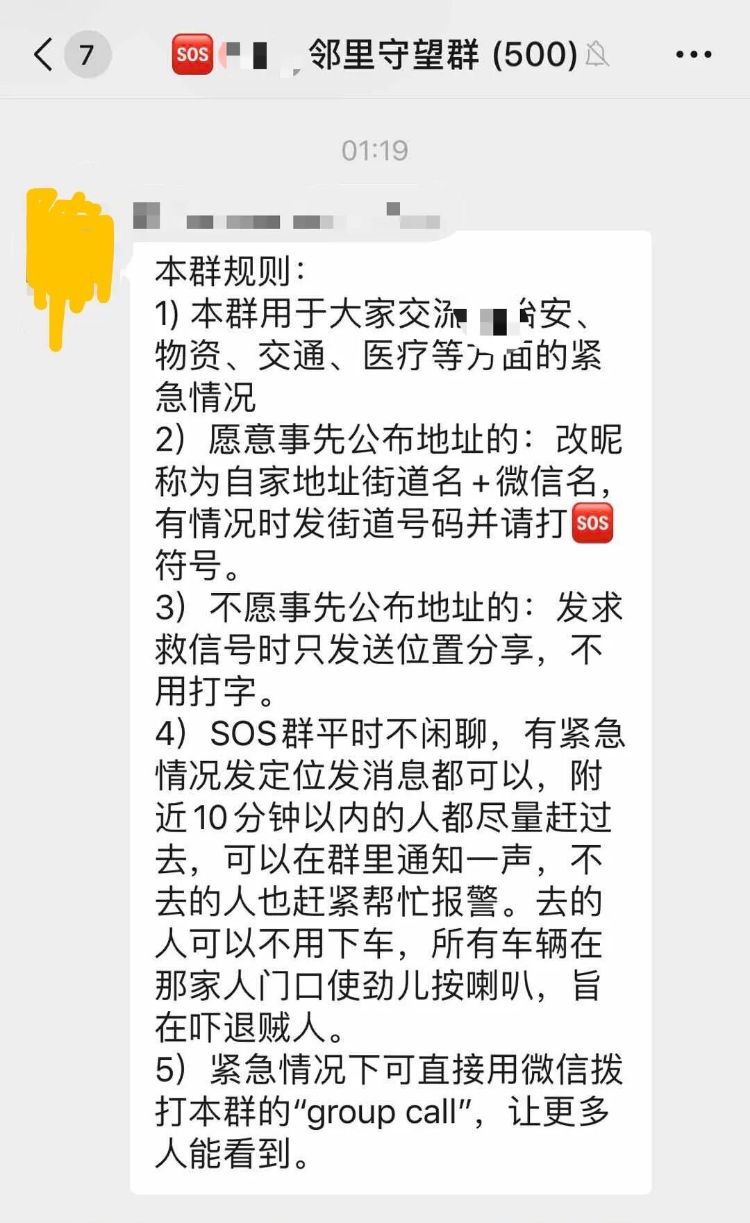 每天几乎都有人在群里告诉新入群的人,这些群不用于闲聊,而用于大家交流治安、物资等紧急情况,最主要的作用,就是发生紧急安全事件时,大家可以互帮互助。