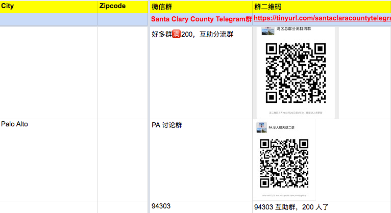 直到当天夜里12点,布谷仍然活跃在各个大群里,把每一个素未谋面的陌生人拉到他们相对应的邮编小群里,帮他们找到“组织”,也找到一份安心。布谷忙到抽不出时间回答硅星人的问题。和布谷一起志愿帮忙建立华人互助组的丽君,则告诉硅星人,“现在最大的困难就是群超过200人,扫码进群的二维码就会失效,就需要手动一个个加。”“你很难去估量最终疫情最终会给美国带来什么,尤其是给美国华人带来什么。”同样在互助群里的硅谷工程师李敏(化名)对硅星人说。国内的人打上半场,国外的人打下半场,海外华人打全场——这看起来像是个段子,却是不少华人的真实写照。从一月国内疫情爆发忙着组织捐赠,到现在美国爆发忙着自保,很多人的生活发生了天翻地覆的变化。在李敏看来,在美华人比很多其他美国民众更了解新冠病毒,也早早意识到这个疾病的严重性,很多人都提前做好了准备。等到美国政府终于重视疫情、开始行动起来的时候,似乎就有点来不及了。李敏回忆几天前,特朗普宣布美国进入紧急状态后,美国民众就出现了一些“失去理智”的恐慌情绪——大量的人挤到超市囤积食物,再加上股市10天内熔断4次,人们对于新冠疫情带来的不确定性感到一丝恐慌。尽管遭到了大量人的反对,第三天,特朗普仍然在一个小时内连发三条推,均使用“Chinese Virus”这个词,而且,在白宫发布会上,面对记者的质疑,他也丝毫不觉得这种做法有什么问题。特朗普的这些行为让华人内心的不安更加强烈了,不少美国政客、民众表示,这种种族主义言论实际上是在“开倒车”。在新冠疫情在美国大规模传播后,各地都有新闻传来有华人遭受来自陌生人的敌意和攻击。在华人众多的硅谷,还有中餐厅半夜玻璃被砸被抢,尽管目前还没有证据表明这是针对华人的仇恨犯罪还是普通抢劫。一些人也因此将目前美国正在经历的新冠疫情“怪罪”华人。《纽约客》的记者Jiayang Fan就分享了她出门倒垃圾的过程中被路过的人无端语言攻击的故事。而在硅星人的朋友圈里,也有不少住在纽约、加州的人都讲述了自己最近被歧视和被人背后辱骂“Chinese Virus”的经历。远在英国也同样如此。据CNN报道,一名23岁新加坡华人在伦敦遭遇群殴,暴徒甚至表示“我不希望你和你带来的新冠疫情在我的国家里。”就在人人自危、担心自己和亲友成为种族主义受害者的时候,一些无名英雄在华人社区中诞生了。“说实话,我们不知道最早谁发起互助组这件事的。”丽君告诉硅星人。做“建群自助”这件事的应该有很多,大部分也是分散自主发起,并没有一个组织在牵头,几个发起人之间甚至彼此根本不认识。“我只知道布谷今天牵头在维护,在将这件事继续下去。”她说。按照丽君的回忆,大概昨天上午时间,各个群里都在传一个标记着城市名称和相对应群二维码的共享表格。之后,就有不少人加进来一起维护,甚至将城市细分为邮编,让人们能找到“离自己最近的群组”,在紧急时刻获得最大效率的帮助。没过多久,就有了十几个这样的几百人大群。“但到了中午表格突然全没了,不知道是系统问题,还是有人误删了。于是布谷就承担起来恢复的工作。”丽君说。她自己也开始承担起Palo Alto附近居民的华人互助组建立和拉群。截至发稿,Palo Alto多个邮编的小群加起来已经有接近300名华人加入。建群、拉群看起来简单,但要把大群的人挨个“送”进小群是一个繁琐、耗时和需要极大责任心的工作。为了完成这件事,布谷主动请了一天假。“我一开始没想到这个事情要花这么长时间,但是加好友都需要手机操作非常麻烦。”布谷说自己基本上一整天就在做这一件事儿。甚至傍晚的时候,因为布谷建群、加好友过多,还被微信暂时封号了一个小时。直到发稿,布谷和其他人微信聊天,其他人都仍然会收到“请核实对方身份,谨防诈骗”的字样。“其实我也不知道这个事情谁发起的,谁也在做。”布谷说自己只是其中一份子,没想到海外华人也能如此团结。“非常多人帮忙拉群。已经衍生出十几个群组,我只是其中的‘中转站’”。在发稿前,那个贴满了二维码的表格被无数人访问。从北面旧金山、到华人居多的Cupertino和Sunnyvale,再到南面的海边城市蒙特雷,都有了属于自己的微信群。甚至在华人众多的城市Santa Clara的一些邮编下,热心的华人志愿者还把人们按照街道分开。除了布谷、丽君,还有非常多人在一起维护这个一日之间就建立起来的互助系统:大群里不断有新的邮编小群在建立,甚至每一个邮编下面,又根据街道分到更细致的群。“疫情之下,很高兴看到海外华人团结的一面,包括之前在国内疫情严重的时候,大家一起努着劲给国内医护捐赠口罩。”布谷说。睡前,布谷数了数,单是自己建立的微信群里就已经有快千人了。“除了开群和群里扫码的,这一天我的个人新加好友就有200多个了。这是很有意义的一个经历。”直到夜里1点,为“华人互助群”忙碌一天的布谷才辗转去睡觉。直到采访结束,布谷都没有向硅星人透露她的真实姓名(也请大家不要打扰她)。丽君表示,布谷完全是出于热心才牺牲自己的时间、精力来做这个事儿。“她本身是个全职工程师。建群就是帮助大家,并不图什么。”硅星人聊过的一些志愿者也都表示,并没有所谓的"互助组"这么一个组织,大家都是完全是自发加入的。“