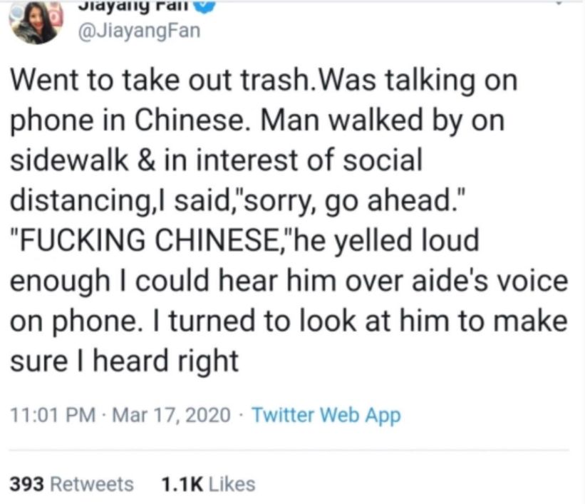 她和一批素昧平生的湾区华人志愿者一起,在这天,创建并维护了一个湾区华人邻里守望群的表格,再按照不同的邮编,引导住在湾区不同地方的华人入群,互相帮助。