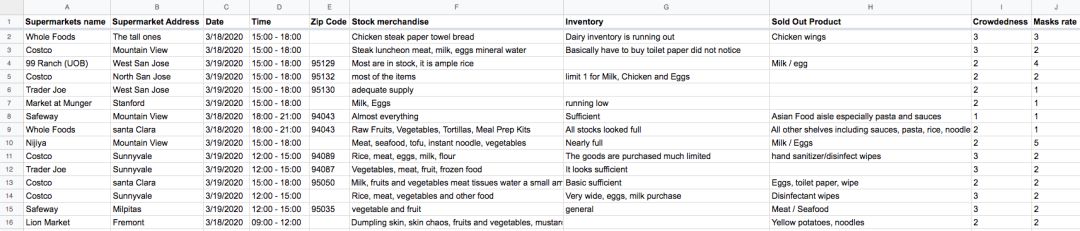 而同一天,在加州另一端,尔湾,另一群华人也在提供着类似的互助。一张这样的图在微信群里流传(注:该截图真实性未经核实):除了这些临时建立起来的互助表格外,另外一个物资表格也在硅谷华人微信群里流传:华人们主动、自发将周围超市剩余的物资存货、缺货、人流量情况、戴口罩人数、营业时间等信息登记在表格中,并且众包更新,让其他人可以随时掌握周围超市的情况,不必去白跑一趟,也减少风险。这样一个表格,在硅谷在宣布半封城状态、物资被部分哄抢后显得尤为珍贵。“虽然超市里大多数商品仍然备货充足,但是免洗洗手液、消毒液、手纸、厨房纸等方便囤货的物资仍然比较难找到。”一位硅谷华人表示。表格里时刻有人更新,大家就更好做出自己的出门购物安排了。除了华人之间的自助外,实际上,华人也正在逐渐成立新的临时组织,为美国其他民众提供支持:一些华人开始主动在小区内设立流动站,为邻居们提供口罩;一些华人在超市的停车场,将多余的口罩送给没有防护的老年人;一些人开始主动为社区中不方便出行的老年人和残疾人提供购物、取药等帮助;更多的人向Whole Foods等大型超市建议,让超市提前开门一小时,专供老人购物,也在论坛中提倡大家关心一下周围行动不便的老人,帮他们进行生活必需品的采买;在美国医护出现口罩、防护服短缺后,湾区一些之前组织过向武汉捐赠的华人组织,重新集结人力物力,对美国当地医院进行集体捐赠。总之,硅谷的华人在行动,为他人、为社会出了一份力。