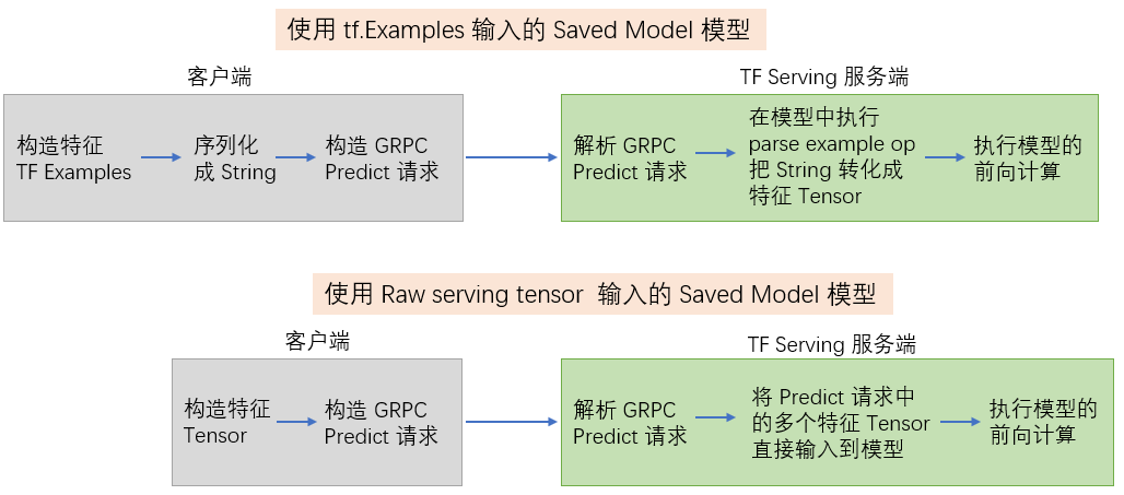 这两种方式在客户端和TF Serving 服务端的处理都有些不同,如下图所示,使用TF Examples的输入方式需要在客户端先序列化成 String,然后在TF Serving 服务端的模型里使用 parse example op 将 String 反序列化成输入特征的 Tensor,再执行模型的前向计算。而使用Raw Serving Tensor 就少了这两部分的操作。TF Examples的序列化和反序列化操作会给端到端的推理服务性能带来一定的损耗,因此我们的CTR 类业务基本都在使用第二种模型输入的方式。