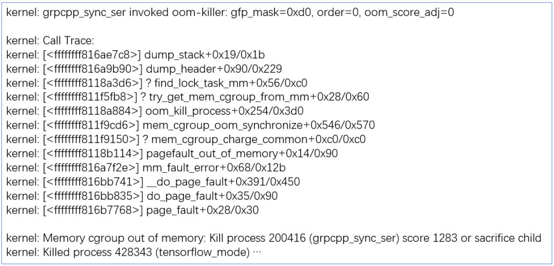 这个现象很让人困惑,到底是什么进程(或线程)突然增加了?我们之前分析过TFServing的线程模型,主要的工作线程是由模型的 Intra 和 Inter OP 配置来控制的,不应该出现增加的情况。于是我们查看了物理机上的 message日志,发现了被 kill 的线程,居然是grpcpp_sync_ser。从日志上可以看出,grpcpp_sync_ser申请使用物理内存,这时出现缺页中断,进入到page_fault,但是容器的内存已经被分配光了,于是就被cgroup kill 了。