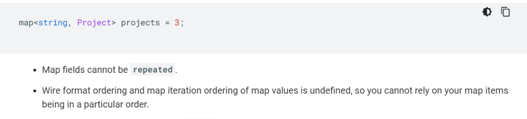 再进一步查看 Protocol Buffers 关于 map 的文档定义,里面明确说明了map 迭代的顺序是没有定义的,代码不能依赖于map里面的 item 是某种特定的顺序。