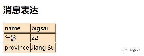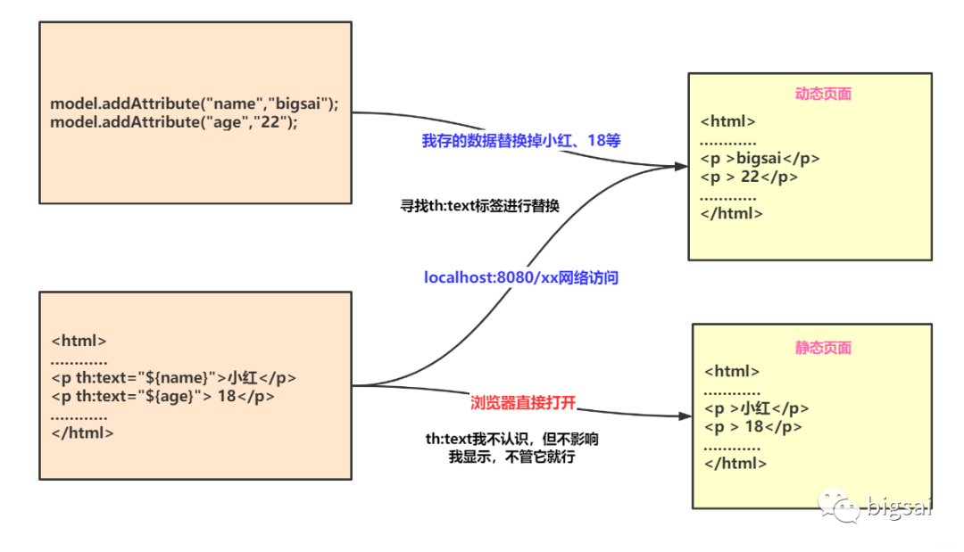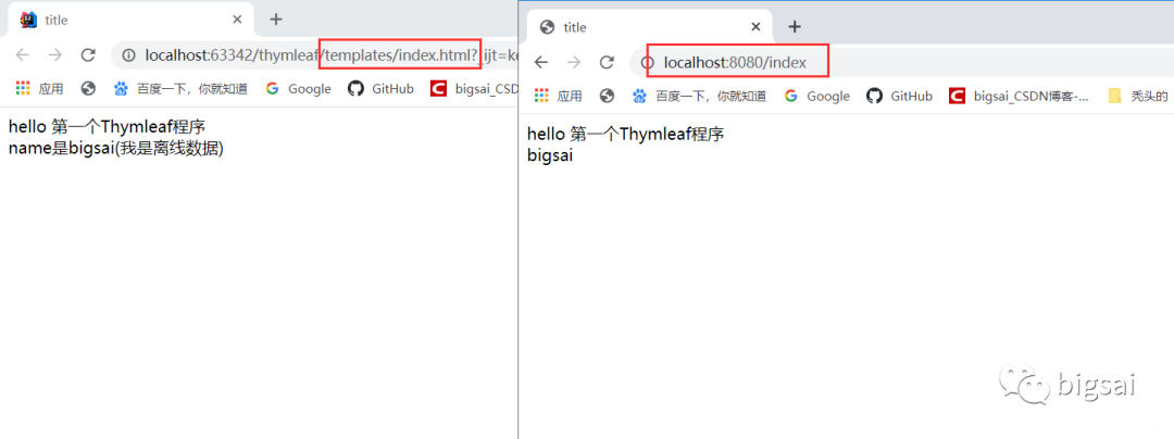 你可能会对<div th:text="${name}">name是bigsai(我是离线数据)</div>感到陌生,这个标签中的th:text="${name}"就是Thymeleaf取值的一个语法,这个值从后台渲染而来(前面controller中在Model中存地值),如果没网络(直接打开html文件)的时候静态数据为:name是bigsai(我是离线数据)。而如果通过网络访问那么内容将是前面在controller的Model中储存的bigsai。