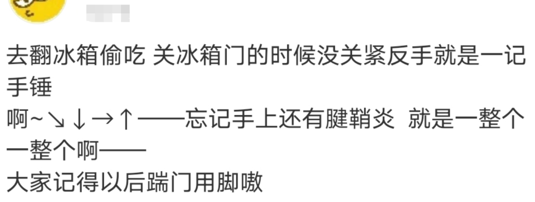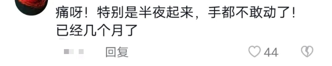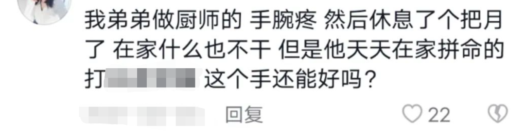 还有网友吐槽,亲人因为厨师的工作患上了腱鞘炎,发作后决定休息一个月、让手得到喘息。
