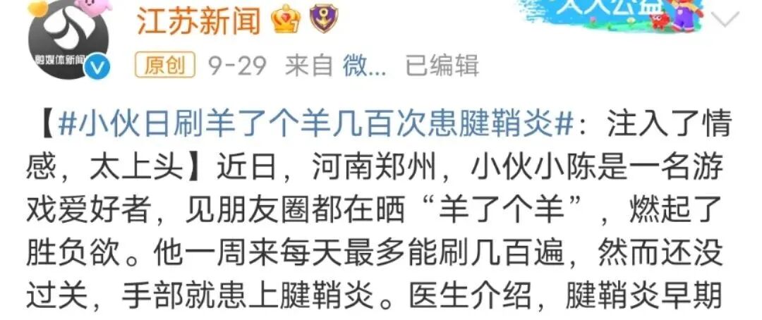 之前有新闻报道,一位河南小伙每天刷上几百遍“羊了个羊”结果患上了腱鞘炎。