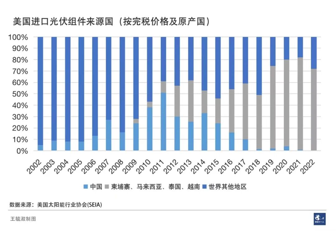 2019年和2020年中美光伏贸易量有所反弹。但到了2021年,在政治因素影响下,中国光伏产品对美出口再创新低,2021年和2022年的出口量几乎可以忽略不计。不过,美国从越南、马来西亚、柬埔寨和泰国这四个东南亚国家进口的光伏产品连年攀升。近三年来,这四国产品占美国进口光伏总量的比重都在70%以上。![]()