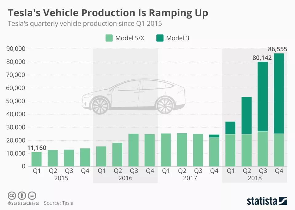 到了2017年Q4上了m3给续上增速,总产量继续攀升到2018年Q4的8.7万辆,到了2019年Q2到了9万辆的规模。