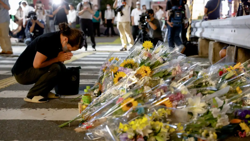 7月8日,民众在安倍被枪杀的地方献花、祈祷。图源:路透社