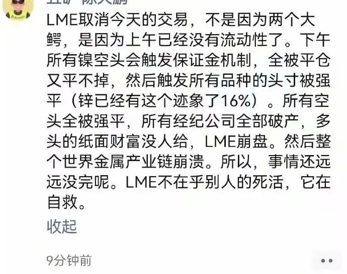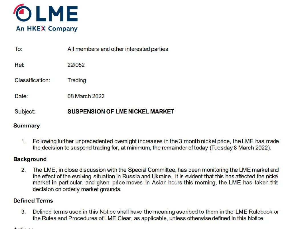 3月8日白天青山控股被外资巨头逼仓的事情闹得沸沸扬扬,晚间又有新进展,而且是大逆转!伦敦金融交易所(LME)选择了“拔网线”:取消所有在英国时间2022年3月8日凌晨00:00(北京时间3月8日早上8:00)或之后在场外交易和LME select屏幕交易系统执行的镍交易。