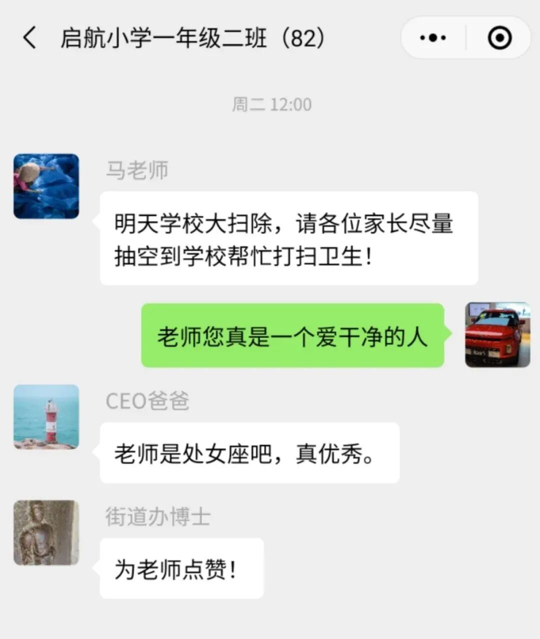最近家长委员会偷偷建了一个小群,CEO爸爸众筹给老师买了一身小西服,让老师上课时候穿。街道办博士给老师众筹送了一辆电动车,让老师上下班骑。