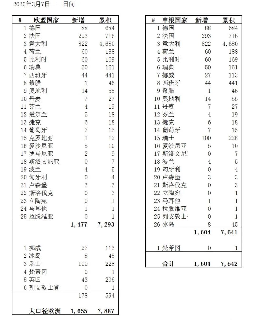 换个口径,即申根签证区。排除掉尚未全部开放自由流动的罗马尼亚,加上梵蒂冈,数字是单日新增1,605例,累积7,642例。