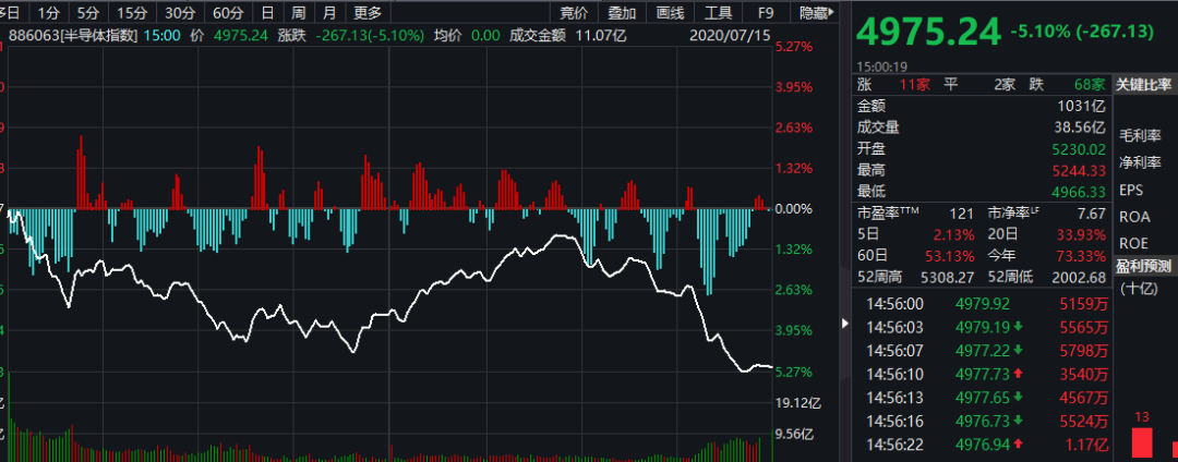 据wind资讯中的半导体指数行情,近期半导体指数成交金额约为1000亿左右。若中芯国际上市,首日成交有可能超过半导体板块一半以上成交量。所以,这只股票对整个板块造成了巨大冲击。沪硅产业这匹黑马也栽了,由涨逾5%变成大跌近20%,整个板块指数杀跌超5%,市值跌去近1200亿元。