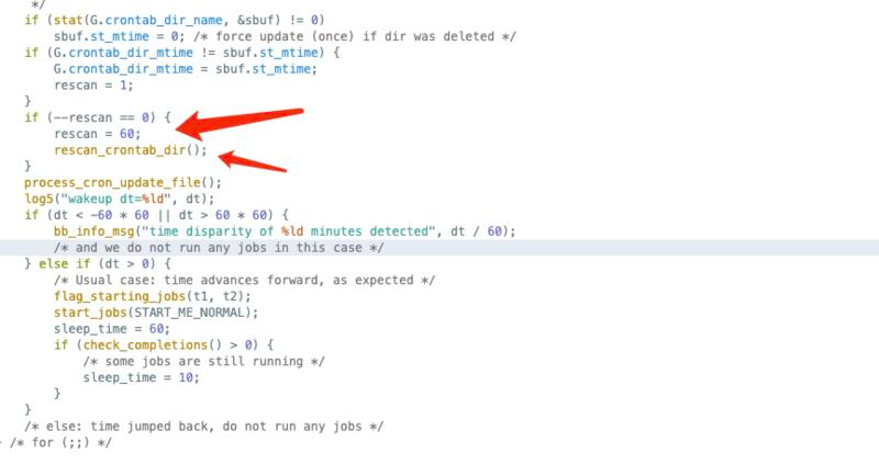 诚然, Cron 实践中还有每个小时(60分钟)不检查 st_mtime 强制更新新任务的实现(代码如下图),但包含这个设计的实现目前运用比较广泛的仅有 busybox-cron,会使EXP变得小众且不通用;如果你发现原本已经放弃的命令执行利用,吃个饭后Shell居然过来了,可能就是这个原因。