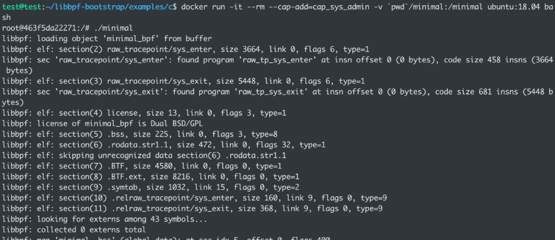 编译后在拥有 CAP_SYS_ADMIN 权限其他配置默认的root用户容器内运行一下,: