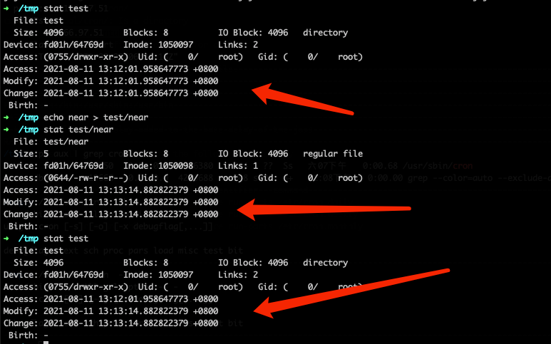 在我们代码审计的所有 Cron 实现中,无一例外,察觉到文件更新的方式都是对比配置文件路径的 st_mtime。在操作系统层面,文件夹内任何文件编辑、新增、删除、修改等操作,操作系统都会更新 st_mtime。如图: