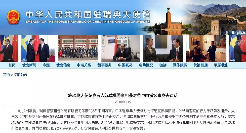 9月15日,我驻瑞典大使馆官方网站发布《驻瑞典大使馆发言人就瑞典警察粗暴对待中国游客事发表谈话》,强调瑞典警察的行为严重侵犯中国公民的生命安全和基本人权,要求瑞典政府立即对事件进行彻查,及时回应当事中国公民提出的严惩、道歉、赔偿等要求。