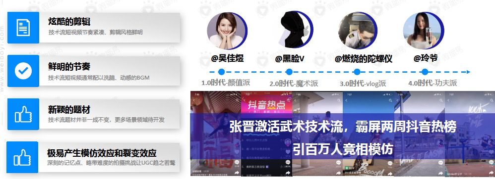抖音:抖音平台的前期,一部分内容由“技术流”引领,如今“技术流”的风潮再现江湖,升级的内容将品牌营销推向至高点。