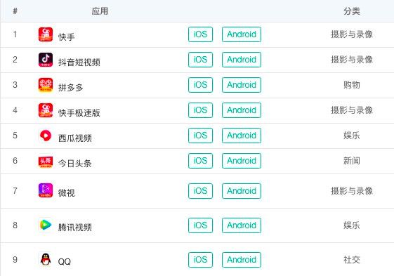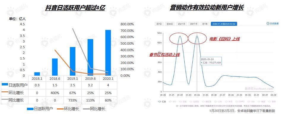抖音:今年1月,抖音平台公布最新日活用户突破4亿,在短视频整体市场用户增长进入深水区的阶段,增长趋近缓慢,但整体形势利好。春节期间,通过集红包、院线电影《囧妈》免费等一系列营销活动,将APP下载量推向高峰。