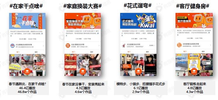 快手:品牌进行“正能量营销”、花式“宅”营销、“科普”营销,在两平台的动作趋向一致,但侧重点稍显差异。例如,通过快手标签化“宅家”专区,场景化“老乡们”在家日常遛弯、扯闲篇儿,延续快手「普世」「接地气」路线。
