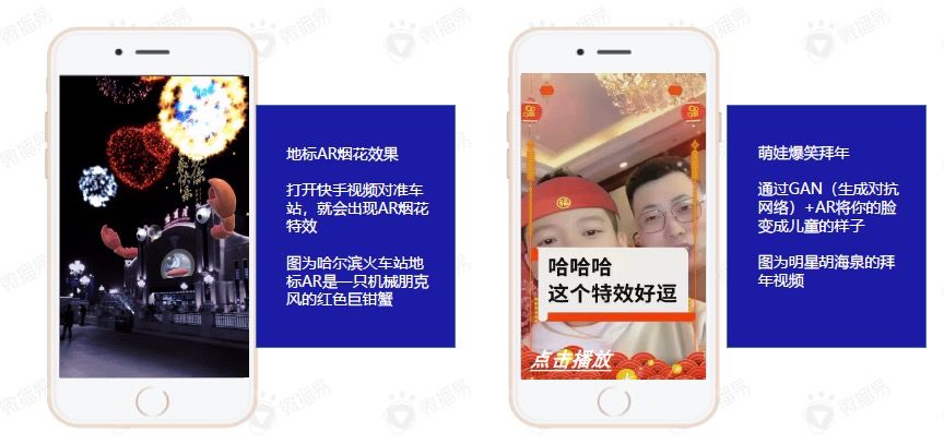 除此之外,快手更加注重“黑科技营销+场景化营销”,以拜年作为切入点,让AR等技术在拍摄中发光发热。例如地标AR放烟花、萌娃拜年、新年灯牌等,让全行业营销更加生动化、趣味化,满足用户接受度。