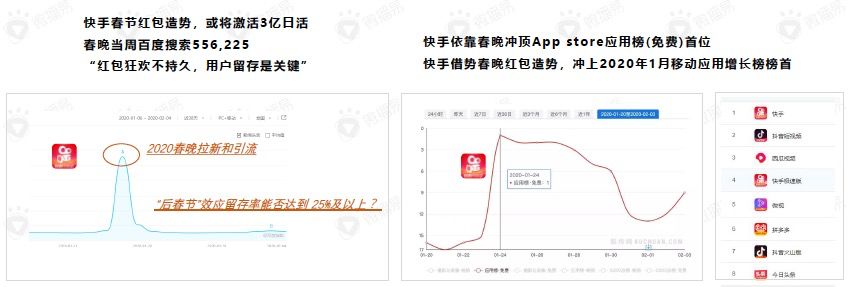 快手:捆绑春晚打造“国民级曝光”,通过“快手抢红包”、“邀请好友拆红包”等诸多营销方式,冲顶App Store应用榜(免费)首位,冲击2020年1月移动应用增长榜榜首。
