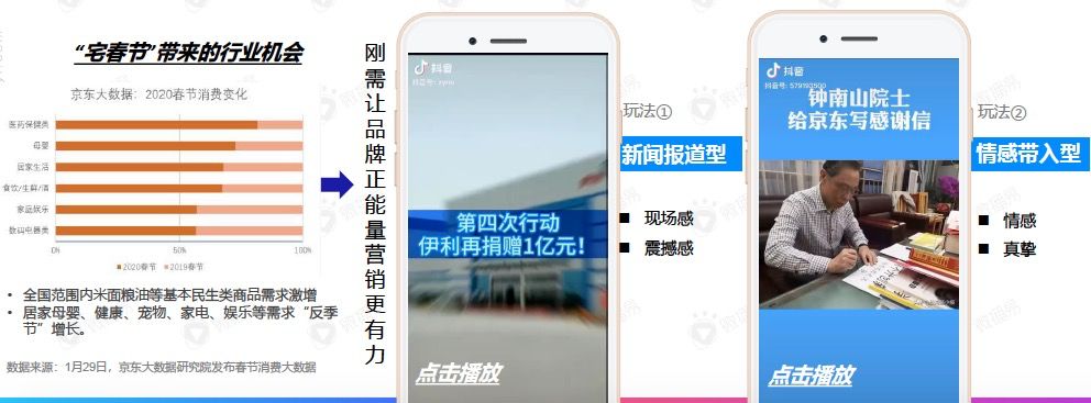 抖音:疫情期间,品牌正能量营销发光发热,通过自媒体的第三视角进行扩散传播,将食品饮料、卫生用品、医疗保健等刚需品的关注度集聚,帮助品牌沉淀品牌资产。
