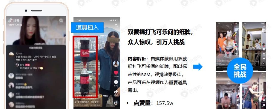 以抖音自媒体@玲爷为例,双节棍打飞可乐间的纸牌,引万人挑战,单条视频点赞量达157w。