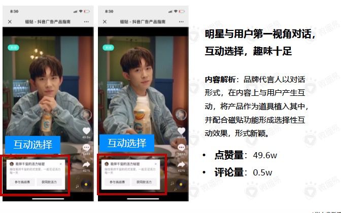 此外,互动视频也是抖音创新性的挑战,用户通过选项进行视频的互动,参与剧情的走向。互动视频撩动用户参与感,深度挖掘存量市场。当该种形式不断完善,品牌与用户的距离将进一步拉进,未来营销土壤肥沃,将成为品牌营销的新一轮发力点。