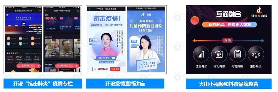 抖音:1月23日,抖音上线“抗击肺炎”频道,提供疫情的最新动态。权威解读以及卫生防疫的相关知识。同时,打通抖音与抖音火山版(原火山小视频)用户圈层,信息全面内容整合升级。
