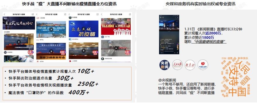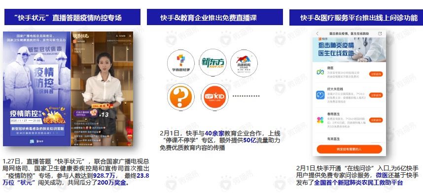 此次,快手发挥“直播”优势,将“短视频+直播”两种形式充分调用,全方位资讯展示,同时直播答题、线上问诊、联合教育机构发起“停课不停学”专区,花式运营动作将用户沉淀凿深,完美诠释平台的社会责任感。
