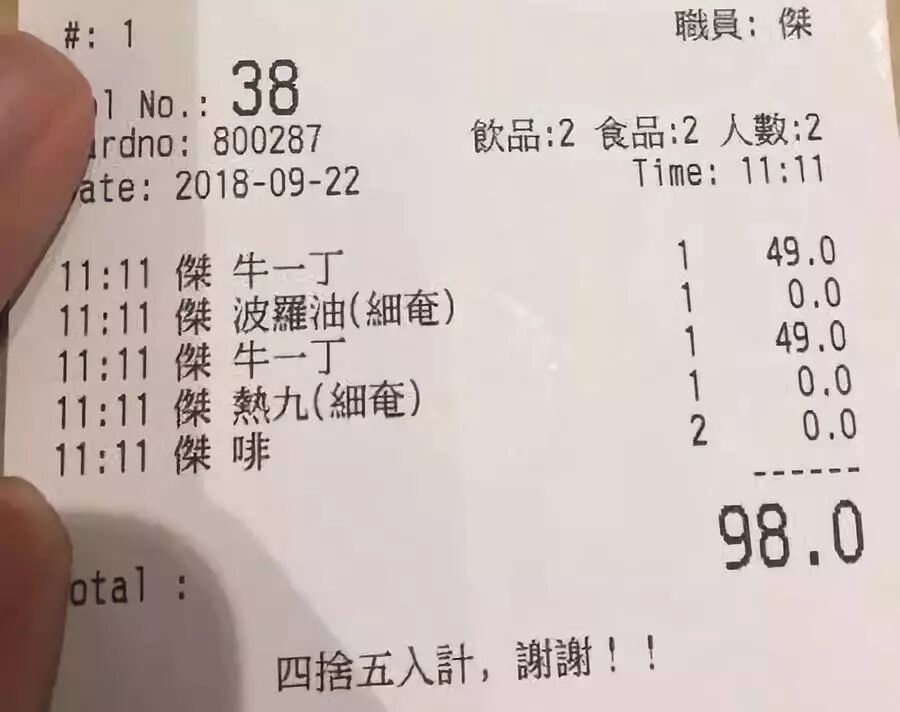 最后得到的消费小票,乍一看就是天书,“热九”就是热狗,细奄,就是小份奄列——就是前面说的煎蛋卷,咖啡简称为“啡”。看着小票上满满的空,就觉得香港的菜单,简直是菜单里的八大山人,美食版的《春秋》,香港版的“马逸毙犬于途”——一切尽在留白中。