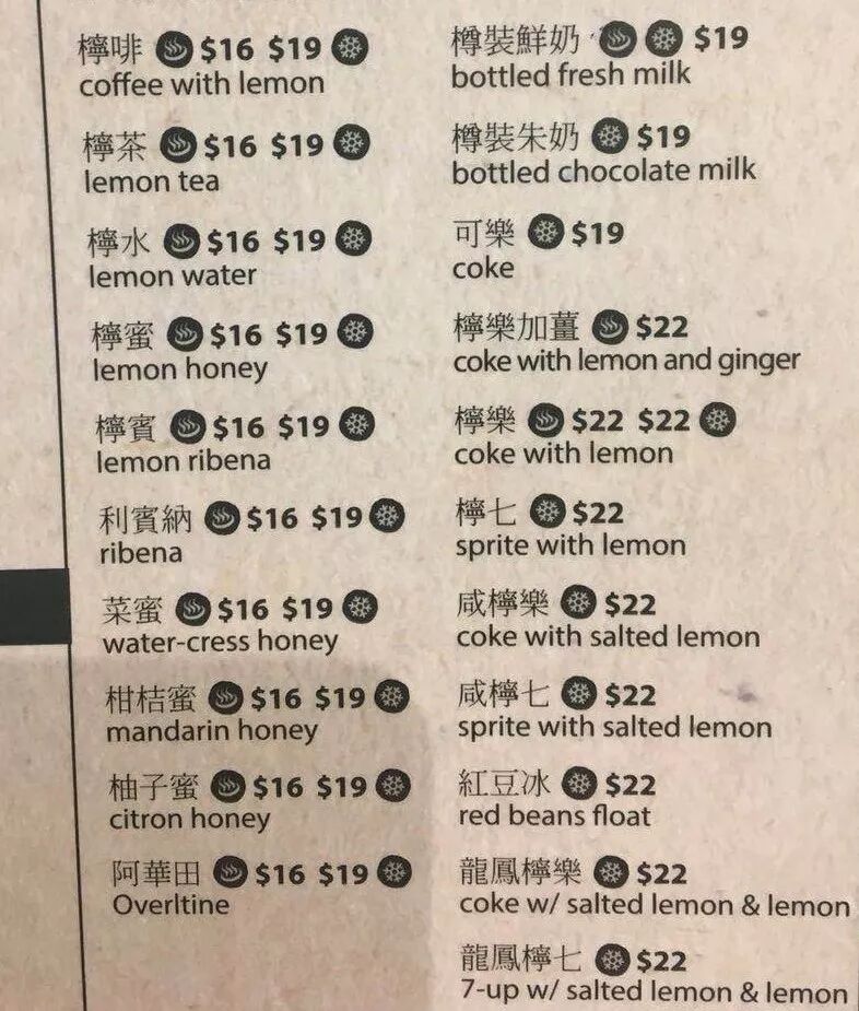 除了对速度有执念,香港茶餐厅的菜单对“柠”也是下了死劲的折腾,往往在“柠”字下面有十八罗汉——柠乐(柠檬可乐)、柠乐煲姜、咸柠七、柠宾等。