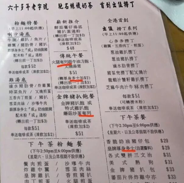所以说茶餐厅是香港的代表,多国人民的共居空间,国际大都市毫不留情的高速度,共同把菜单塑造成了现在这个样子。