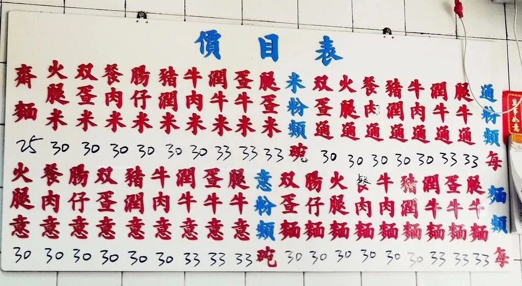 拿著名的深水埗“维记咖啡粉面”来举例,菜单上占了一大片的各种“米”,不是指米饭,而是米粉,出现多次的“润”就是猪肝,“餐”的意思就是午餐肉之类的罐头肉。他家的招牌是“润牛米”,翻译过来就是猪肝牛肉米粉。其它茶餐厅也如此,一通百通。