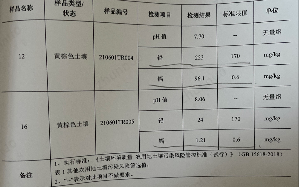 沙河子镇黄棕色土壤,铅超标1.3倍,镉超标160倍