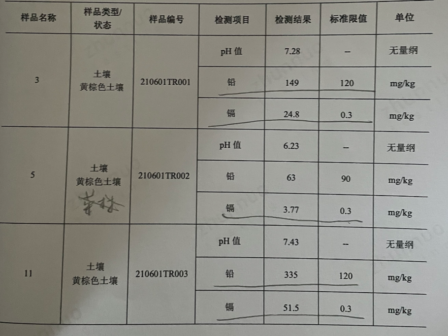小葱-采样于陕西锌业有限公司附近的李堡子村,小葱距离厂区直线距离82米,检测出镉为0.54mg/kg,标准值为0.05,超标10.8倍。