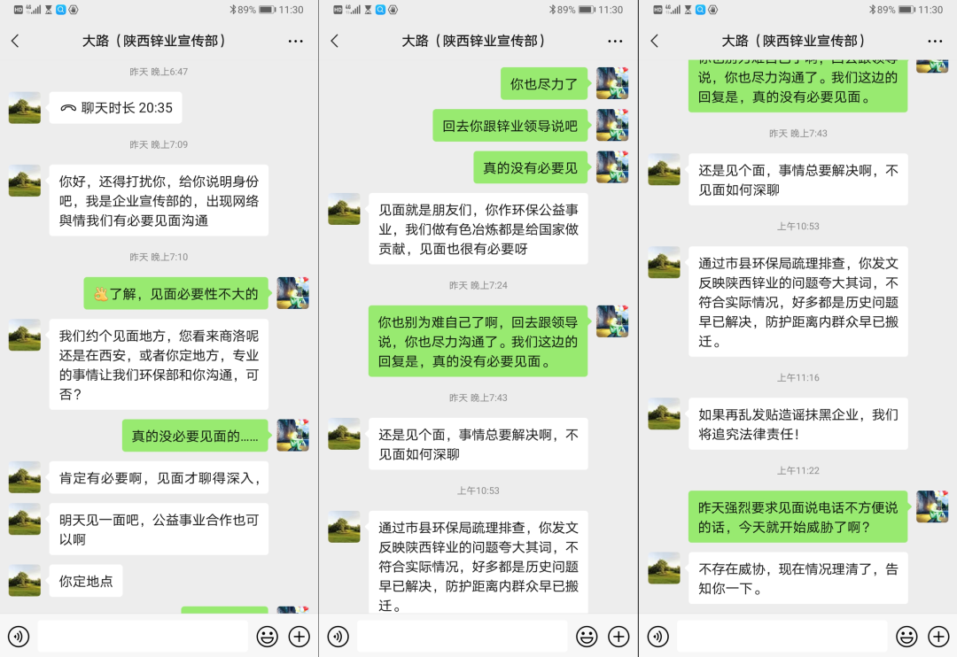 10月8日我们发布《陕西沙河子镇重金属污染事件调查》,10月9日陕西锌业找上来,表示强烈要求见面,表示“公益事业合作”,我们表示拒绝见面及“合作”。10月10日,陕西锌业称“如果再乱发贴造谣抹黑企业,我们将追究法律责任”。