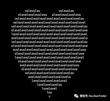 IntStream.range(-15, 15).map(y -> -y).forEach(y -> IntStream.range(-30, 30).forEach(x -> System.out.print(Math.pow(Math.pow((x * 0.05), 2) + Math.pow((y * 0.1), 2) - 1, 3) - Math.pow(x * 0.05, 2) * Math.pow(y * 0.1, 3) <= 0 ? "love".charAt(Math.abs((y - x) % 4)) : " " + (x == 29 ? "\n" : ""))));成果展示: