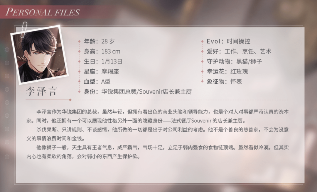 在游戏里,“我”是影视公司的制作人,李泽言所在的华锐集团是“我”的公司的投资方,所以“我”需要向他汇报工作,他也会告诉“我”接下来应该怎么做。而我在现实生活的学习和工作中也会遇到一些难题,李泽言有点像一个老师,在引领我、督促我,教会我成长。
