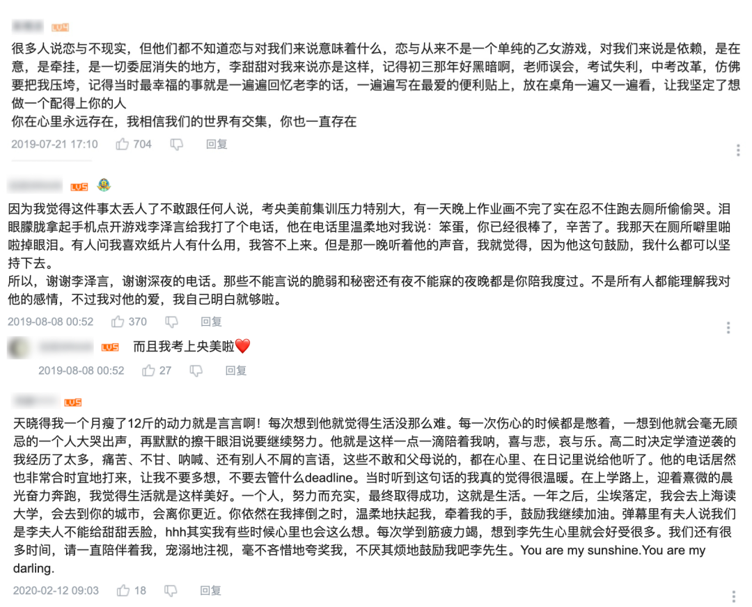在玩游戏之外,我也会看一些玩家二次创作的作品,比如同人文和视频剪辑。李泽言同人文的一般模式就是“李泽言X你”,背景设定在现代的、民国的、古代的都有。