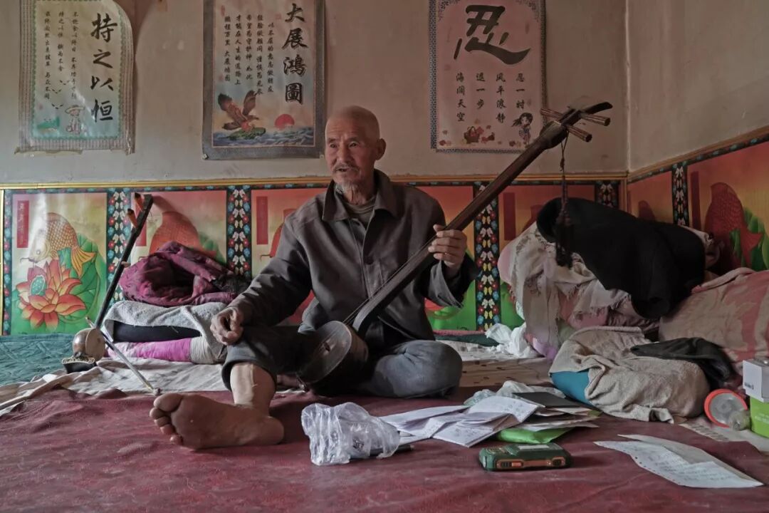 一番嬉笑怒骂过后,老汉从墙上取下板胡和三弦,欢乐深情地唱起解放年代的颂歌。