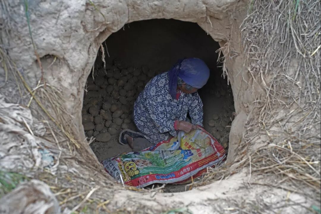 2018年6月18日,蔡焦英在存储土豆的地窖里搬运土豆。