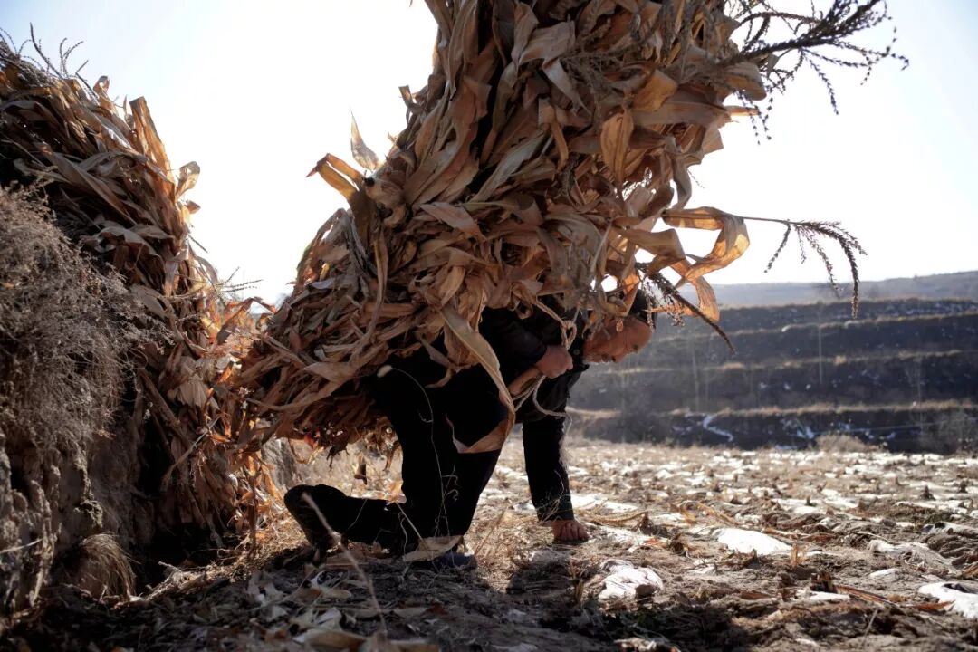 弟弟张文徳从一里地外的庙里来帮大哥背玉米秆。收割下来的玉米秆斜靠在田埂上。张文德单腿跪地一只手拽着绳子扣到肩膀上,另一只手撑在地上,吃力地缓慢爬起。