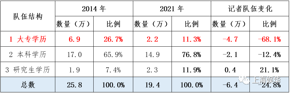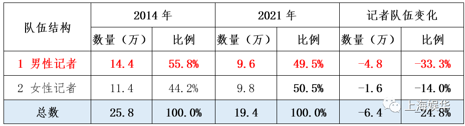根据上述公开资料,上海娱华传媒研究中心对2014-2021年期间全国记者队伍变化进行了深入研究。