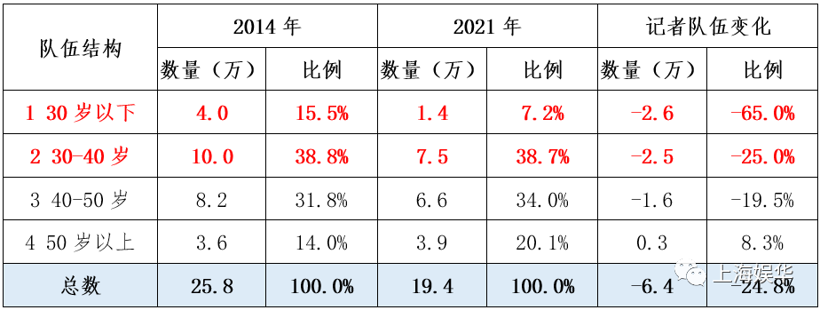 但在不经意的八年间,30岁以下年轻记者减少了65.0%,40岁以下中青年记者减少了36.4%,记者队伍真老了!