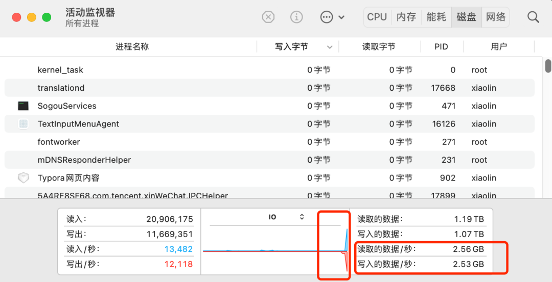 此时我的笔记本电脑的磁盘开始出现“沙沙”的声音,通过查看磁盘的 I/O 情况,可以看到磁盘 I/O 达到了一个峰值,非常高: