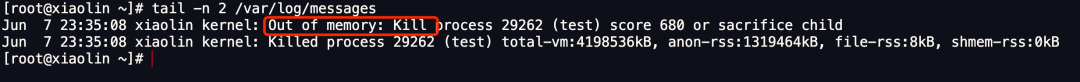 通过查看 message 系统日志,可以发现该进程是被操作系统 OOM killer 机制杀掉了,日志里报错了 Out of memory,也就是发生 OOM(内存溢出错误)。